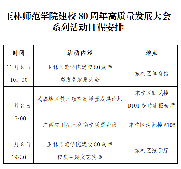 八秩桃李满,一生玉师情。2025年11月11日,玉林师范学院将迎来建校80周年华诞。自第一号、第二号公告发布以来,学校的各项筹备工作得到各级领导、全体师生、海内外校友以及社会各界朋友的热切关注与鼎力支持。谨此致以衷心的感谢和崇高的敬意!