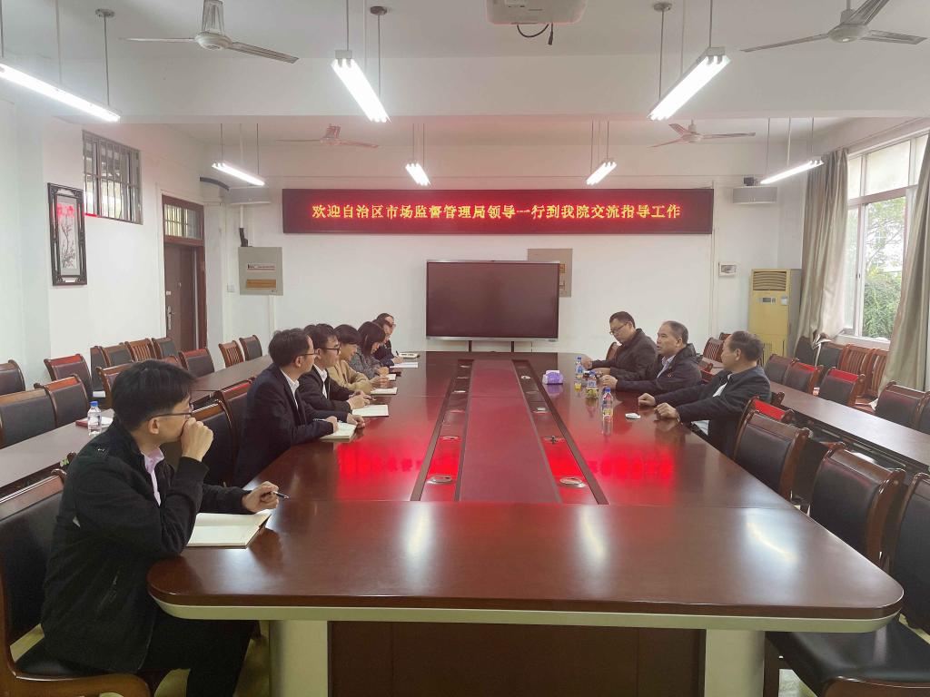 3月30日上午,广西壮族自治区市场监督管理局(以下简称“市场监管局”)二级巡视员苏彩和、玉林市市场监管局局长钟永东一行到化学与食品科学学院进行交流指导。交流会在我校东校区格物楼BA321会议室进行,该院党委书记罗志辉、院长谭明雄等领导班子成员及食品专业负责人参会。