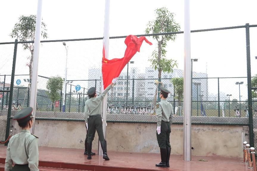升旗仪式上,国旗护卫队护送国旗向升旗台走来,伴随着庄严的《义勇军进行曲》,全体学生怀着对祖国无限的热爱和崇高的敬意,向国旗行注目礼,五星红旗冉冉升起,迎风飘荡。升旗仪式结束后,管金标进行国旗下的讲话,他强调,作为新时代大学生应勇担社会责任和肩上历史使命,热爱祖国,积极报效祖国,希望全体学生以崭新的面貌迎接每一天,丰富自己学习和生活,为建设社会主义现代化强国而努力奋斗。