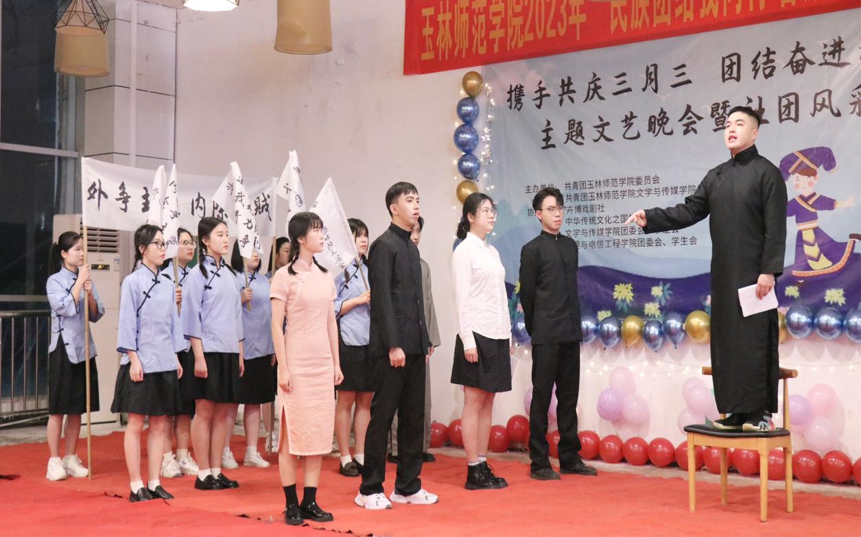 为贯彻落实党的二十大精神,继承和弘扬中华优秀传统文化,铸牢中华民族共同体意识,营造浓厚的壮族“三月三”节日氛围。我校于4月15日晚在东校区尚文阁食堂二楼举办“携手共庆三月三,团结奋进新征程”主题文艺晚会暨社团风采展。我校团委书记范良辰,团委副书记董积有以及文学与传媒学院党委副书记梁丹,团委书记,辅导员出席本次晚会。本次活动由学校团委、文学与传媒学院主办,卉博戏剧社、中华传统文化之国学研究会、物理与电信工程学院文工团承办。我校部分社团及各院学生代表参加。