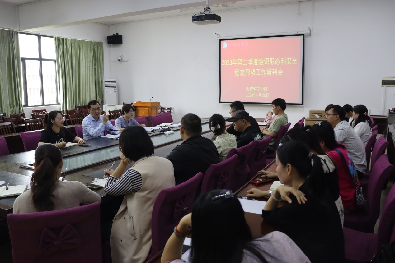 4月28日,教育科学学院于我校东校区明德楼310会议室召开2023年第二年度意识形态和安全稳定形势研判会,会议对2023年第二季度意识形态和安全稳定形势、2023年春季期学生心理健康教育工作进行分析研判。此次会议由该院党委书记崔海波主持,学院领导班子成员、辅导员、班主任和学校心理咨询中心教师参加。
