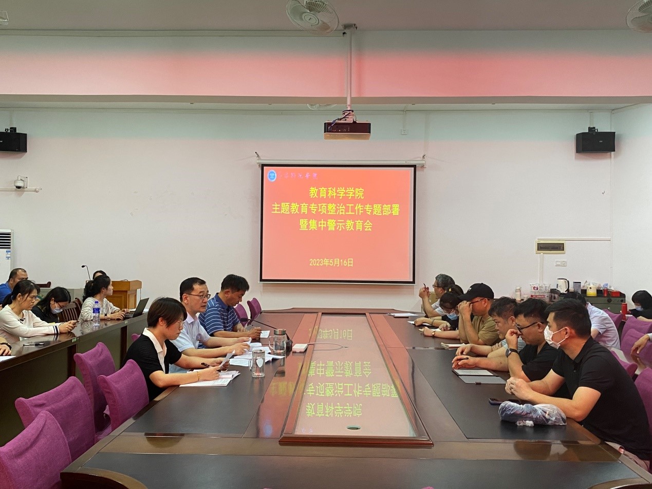 5月16日下午,教育科学学院于我校东校区明德楼310会议室召开主题教育专项整治工作专题部署暨集中警示教育会,学院领导班子成员、全体教职工参加了此次会议,会议由学院党委书记崔海波主持。