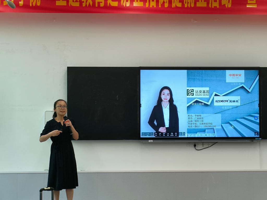 各位优秀校友回顾在学校学习、生活的美好时光,讲述自己励志勤学、刻苦钻研、自立自强的学习经历。随后,校友邹芸芸组织观看江苏恒瑞医药股份有限公司宣传视频,并从公司概况、研发体系、人才培养方案、岗位需求等方面进行了宣讲。校友李丽梅、吴海连依次向学生们分享各自工作经历、工作动力和职业感悟,鼓励感兴趣的学生们加入公司团队,共同努力奋斗。