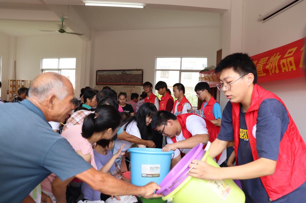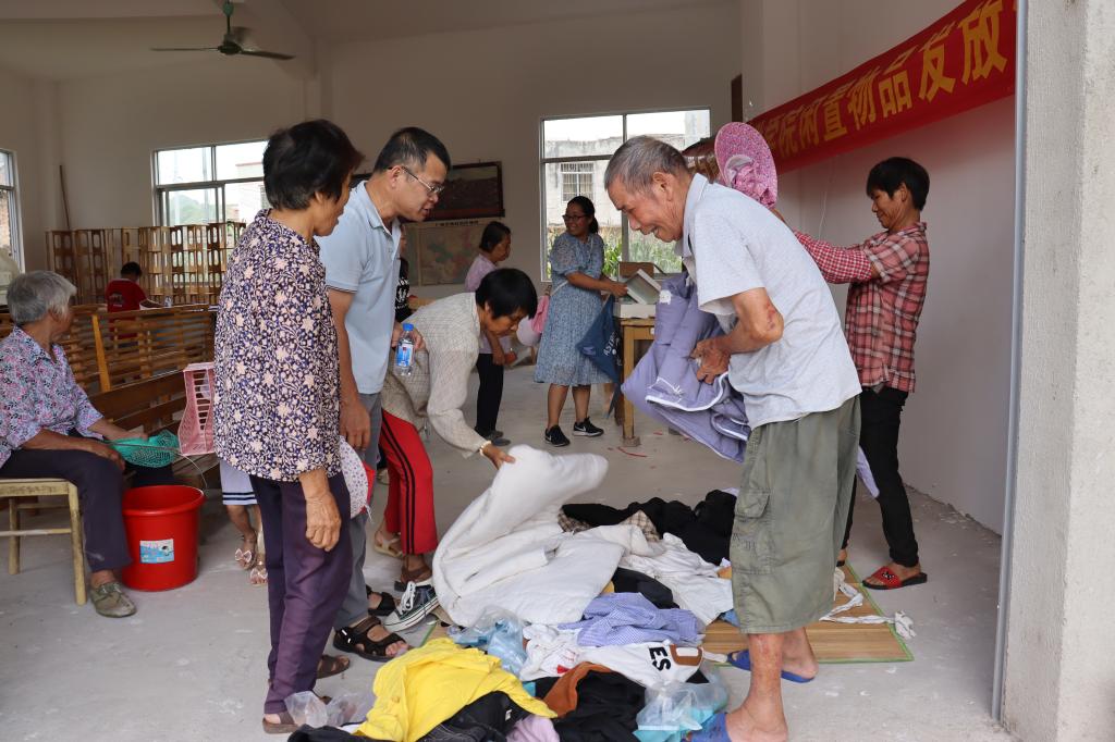 图为志愿者为村民发放闲置物品。