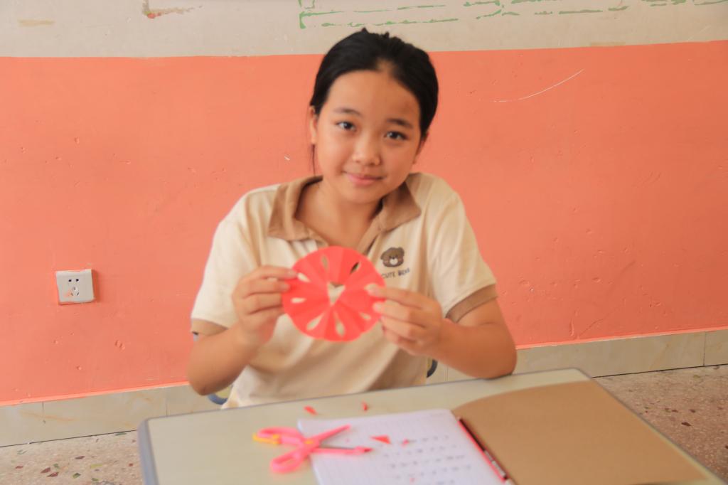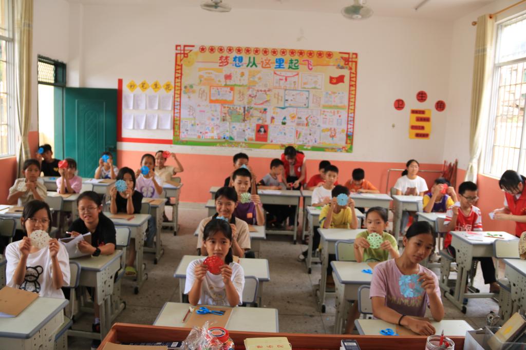 图为志愿者教同学们做折纸手工。