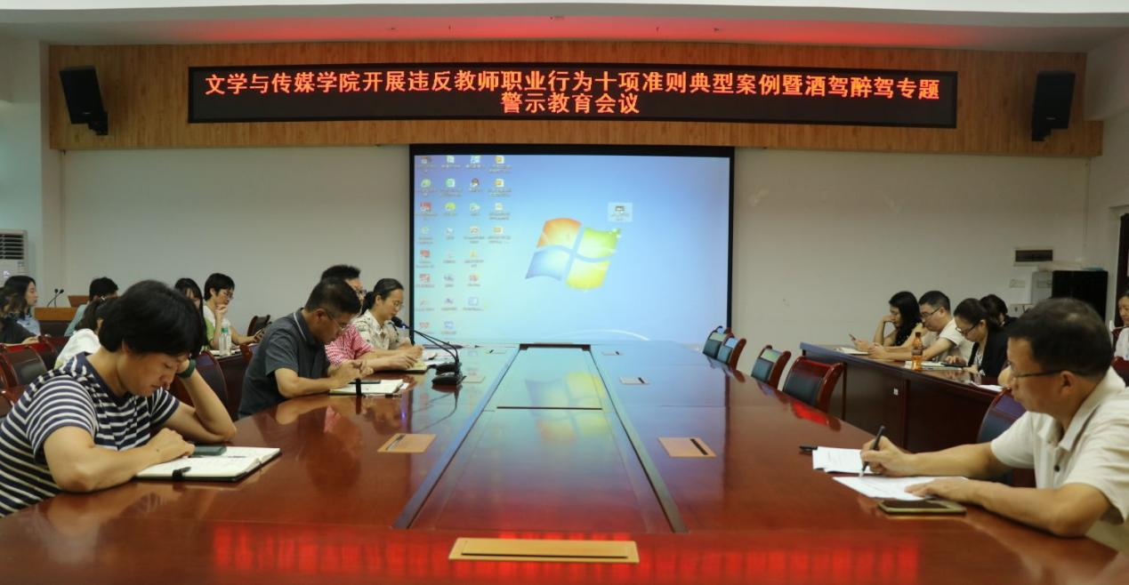 为进一步增强学院党员领导干部和教职工的法纪观念和纪律意识,坚决遏制违反教师职业行为和酒驾醉驾违纪违法行为的发生,大力推进清廉学校建设,9月1日下午,文学与传媒学院于我校东校区至善楼309会议室召开违反教师职业行为十项准则典型案例暨酒驾醉驾专题警示教育会议。学院领导班子及全体教职工参加会议,会议由学院党委书记邱冠主持。