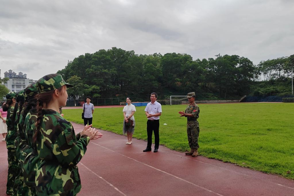 9月7日下午,音乐舞蹈学院党委书记何军、副院长蒋艳前往我校东校区东400米田径场慰问带训教官和参训新生。