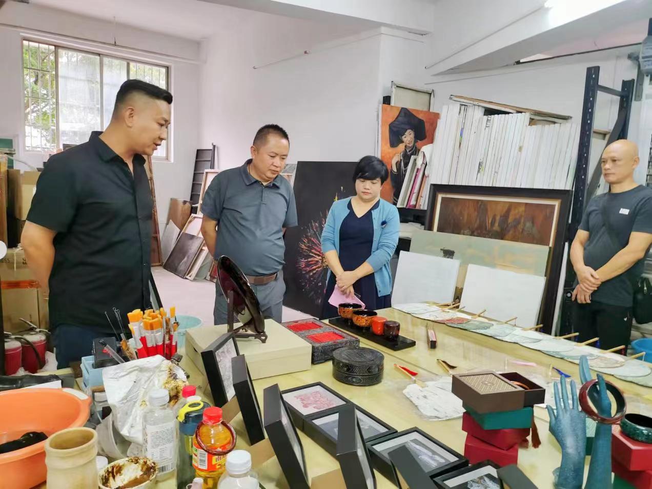 会后,覃新崇一行与该院教师代表围绕如何指导学生深入开展文创设计进行了交流。其间,邱冬梅带覃新崇一行前往学院漆画工作坊进行参观考察。