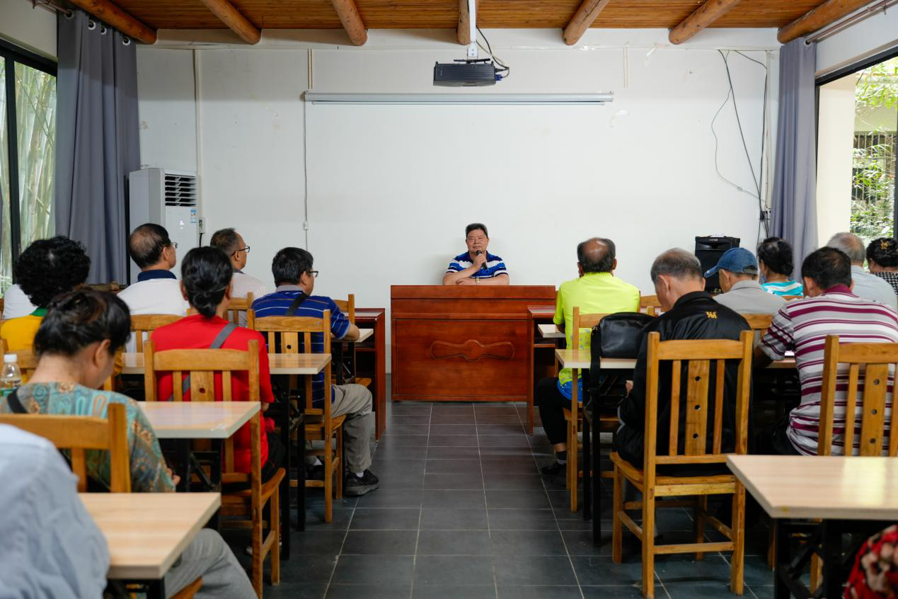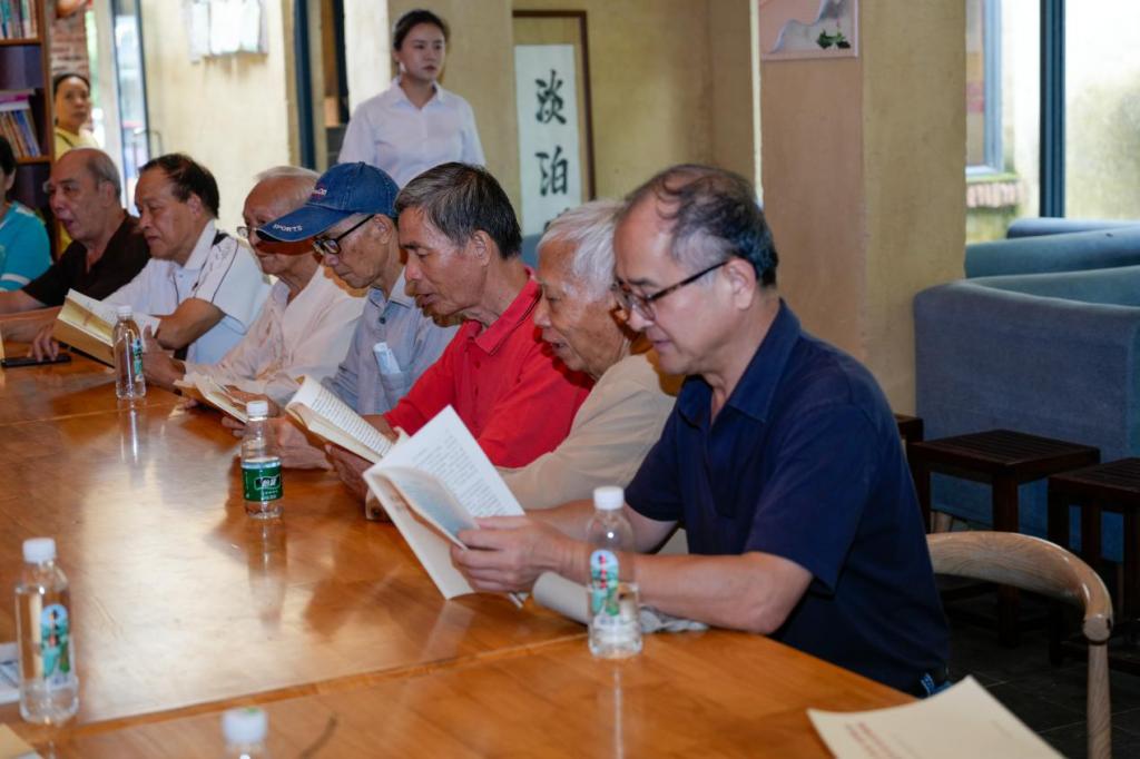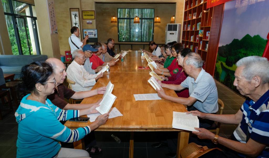 活动中,离退休党员同志在木棉书馆前合唱《没有共产党就没有新中国》《我们走在大路上》等红歌,以高亢嘹亮的歌声传达对党和国家的无比热爱。