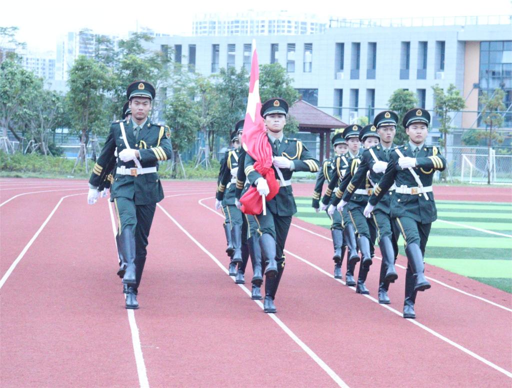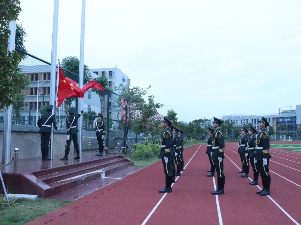 七点整,国旗护卫队迈着整齐矫健的步伐,护卫五星红旗入场。伴随着国歌声,五星红旗冉冉升起,全体肃立行注目礼,齐唱中华人民共和国国歌。