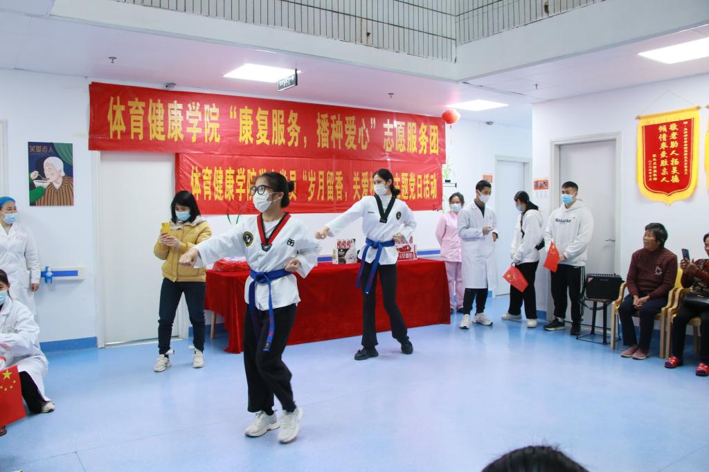 活动共有七项议程,党员和康复协会志愿者协助医生将老人安全推送至活动区域,随后为养老院的爷爷奶奶进行康复按摩放松、表演精彩的太极拳、跆拳道、优雅的舞蹈、回忆青春的大合唱、老爷爷独自献唱,全体党员和康复协会志愿者依次为老人送上爱心礼包,随着全体合唱感恩的心结束活动也接近尾声。