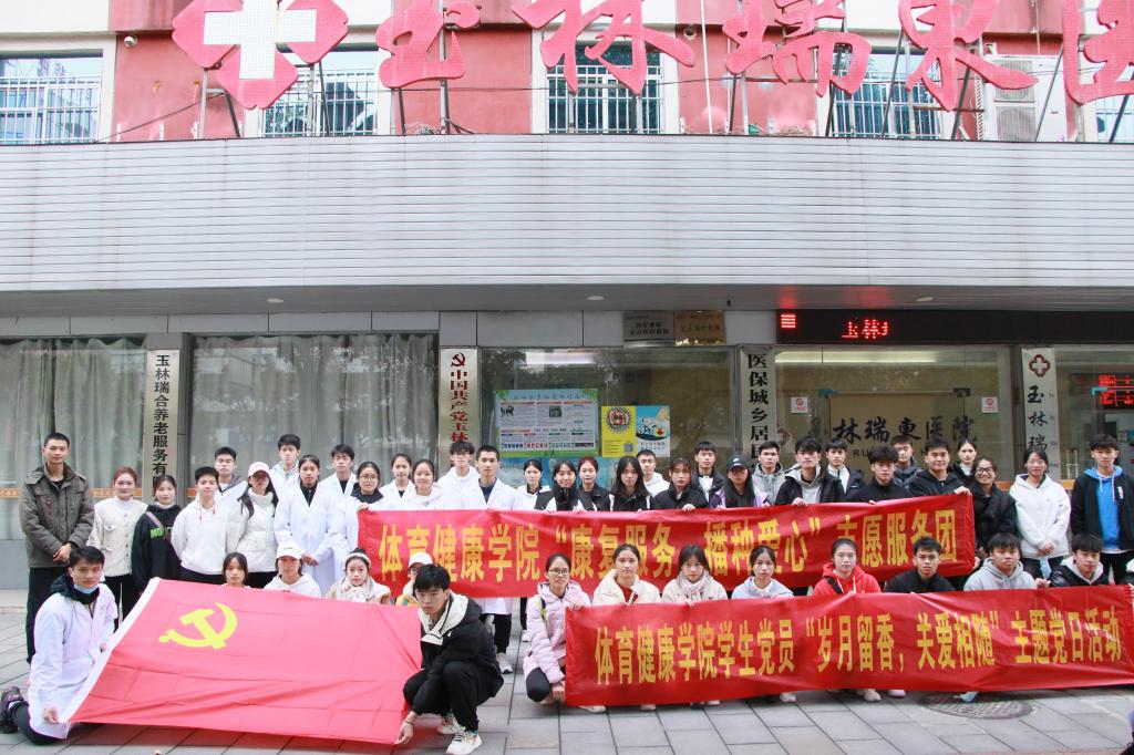 为学习弘扬中华民族传统美德,传承孝道文化,提高老年人的生活质量,推动基层党支部走进基层,贴近群众,充分发挥党员的先锋模范作用,近日,学校体育健康学院全体学生党员、康复协会部分志愿者前往玉林瑞合养老院开展党建带社团——体育健康学院学生党员“岁月留香,关爱相随”主题党日活动。活动由该院各学生党支部和康复协会联合组织开展,该院辅导员和党支部书记负责带队,共有60余人参与志愿服务活动。