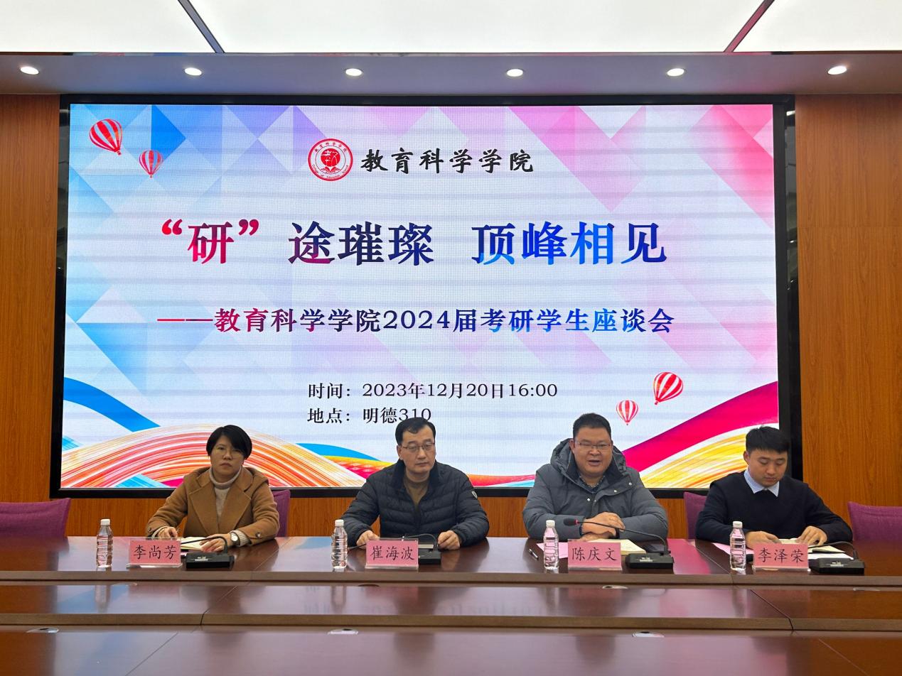 为帮助考研学子振奋士气、坚定信念、做好准备,12月20日下午,教育科学学院于我校东校区明德楼310会议室召开“研”途璀璨,顶峰相见——教育科学学院2024届考研学生座谈会,本次座谈会由该院党委书记崔海波,院长陈庆文,党委副书记李尚芳,2024届考研学子参加,该院辅导员主持。