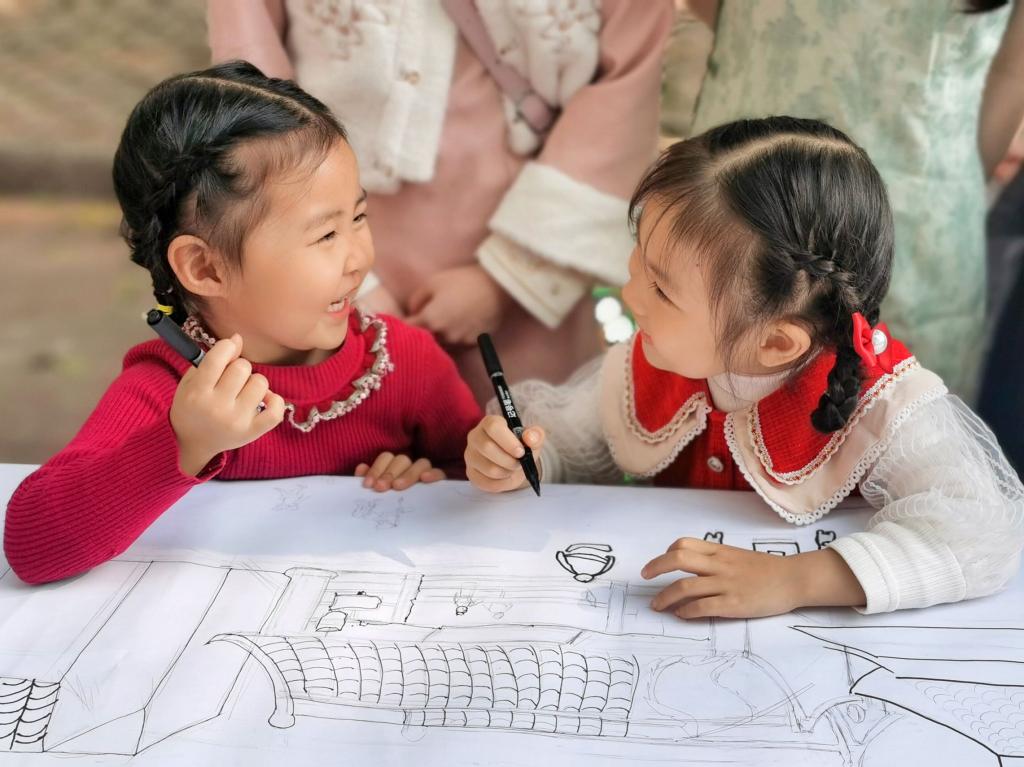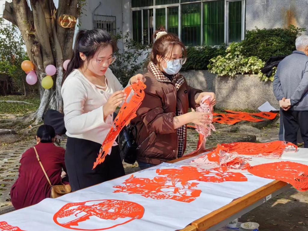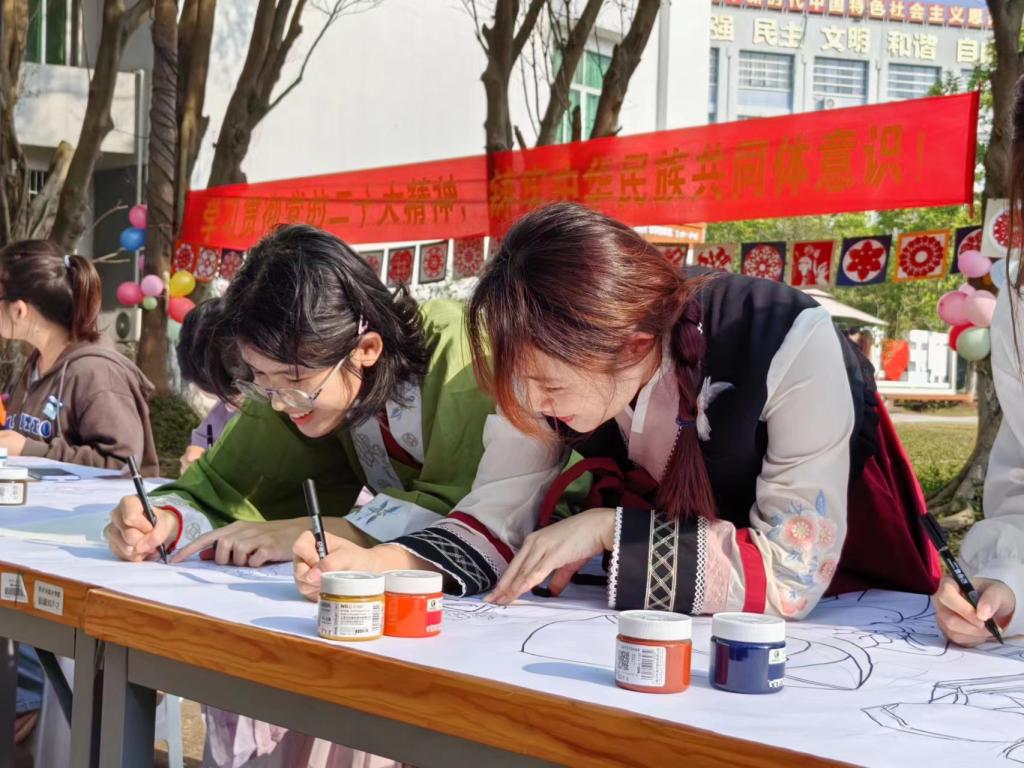 活动分为绘画创作、剪纸创作、粘土创作和美食品鉴四个活动项目,活动现场为全体参与人员提供创作的基本工具。期间,许多穿着各色民族服饰的学生、教师和家属密切交流、互帮互助,共同创作。特别是在绘画创作活动项目中,师生用手中的画笔装饰着纸上56个民族的服饰,线条勾勒流畅,色彩搭配鲜明,整个创作过程有条不紊,井然有序。经过一个多小时的努力,一个个身穿民族特色服饰的人物呈现在画纸上,活动现场处处洋溢着团结、和谐的氛围。