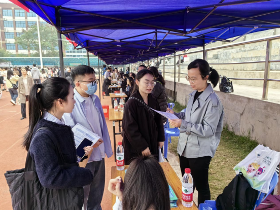 招生就业处党支部在双选会前便向毕业生详细分析当下就业形势,并提前动员我校2024届毕业生关注双选会招聘单位信息认真择业。会场上,副处长梁丹仔细阅览招聘宣传资料,并积极与用人单位沟通交流,详细了解单位发展、用人需求、招聘政策、薪资待遇等情况,推荐我校毕业生,助力毕业生成功就业。此外,梁丹还主动为我校毕业生答疑解惑,指导应聘时的注意事项。期间,我校毕业生积极到场参加应聘,寻找、记录自己心仪的岗位并到展位进行深入交流。