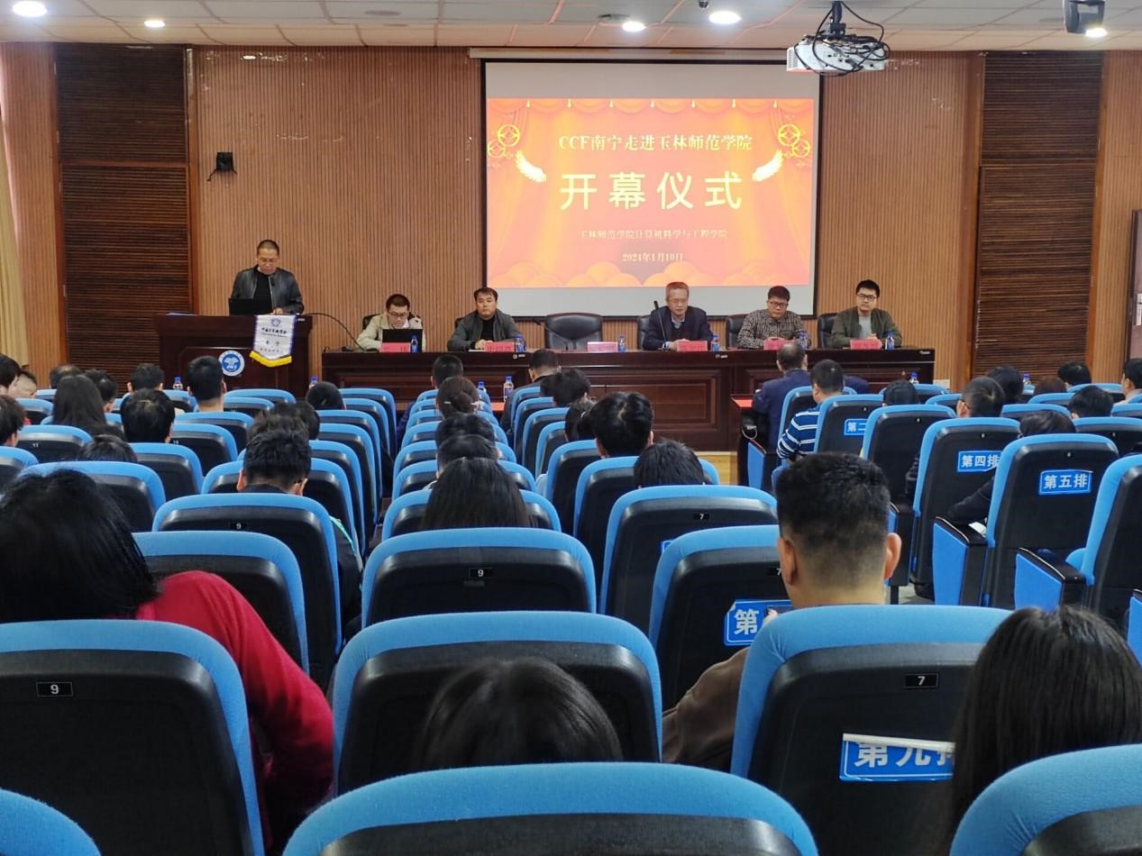 1月10日,中国计算机学会(CCF)南宁(以下简称“CCF南宁”)主席陈宁江教授一行到我校东校区知行楼博士论坛、知行楼306教室、厚德楼2-401会议室分别开展专家学术报告会、信息技术讲座、国家自然科学基金和广西科技项目申报研讨交流会等系列活动。计算机科学与工程学院党委书记方琨、院长陈佐瓒、教师代表、学生代表参加有关交流活动。