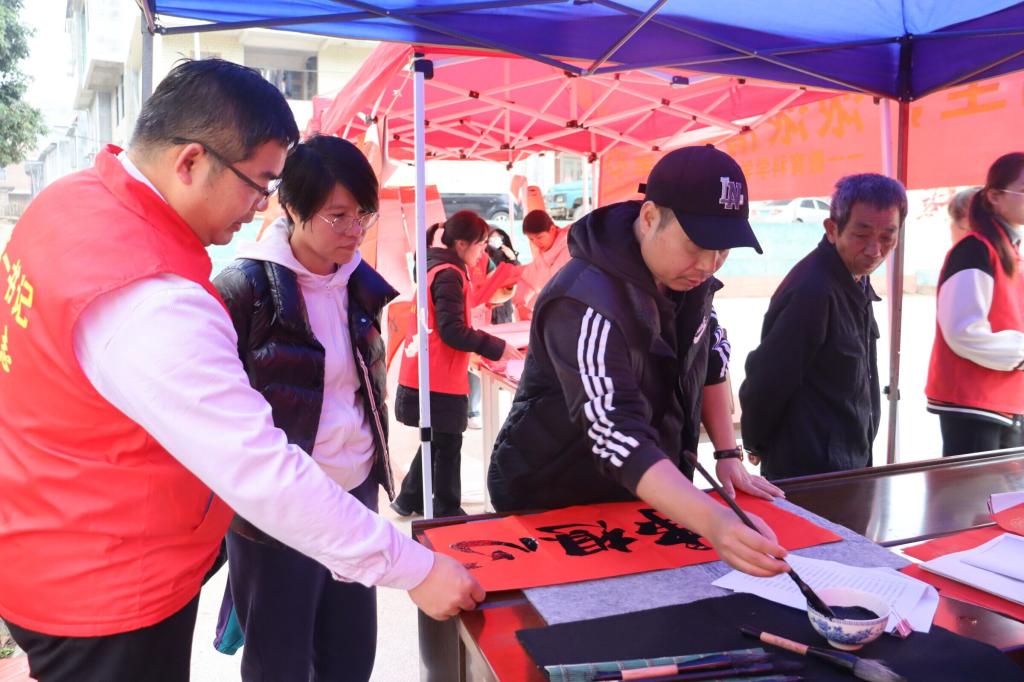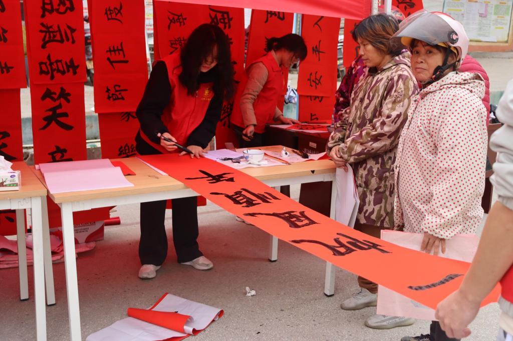 “红木棉”乡村振兴服务团志愿者们在书法教师的指导下,将所学的书法技能运用到实际中,为村民送上自己亲手写的对联与“福”字。村民们纷纷围在一起,感受喜庆的氛围,在欢声笑语中,志愿者们蘸墨挥毫,落笔成书,一副副对联和“福”字跃然纸上,现场弥漫着浓浓的墨香和喜庆的氛围,每个人脸上洋溢着幸福的笑容。