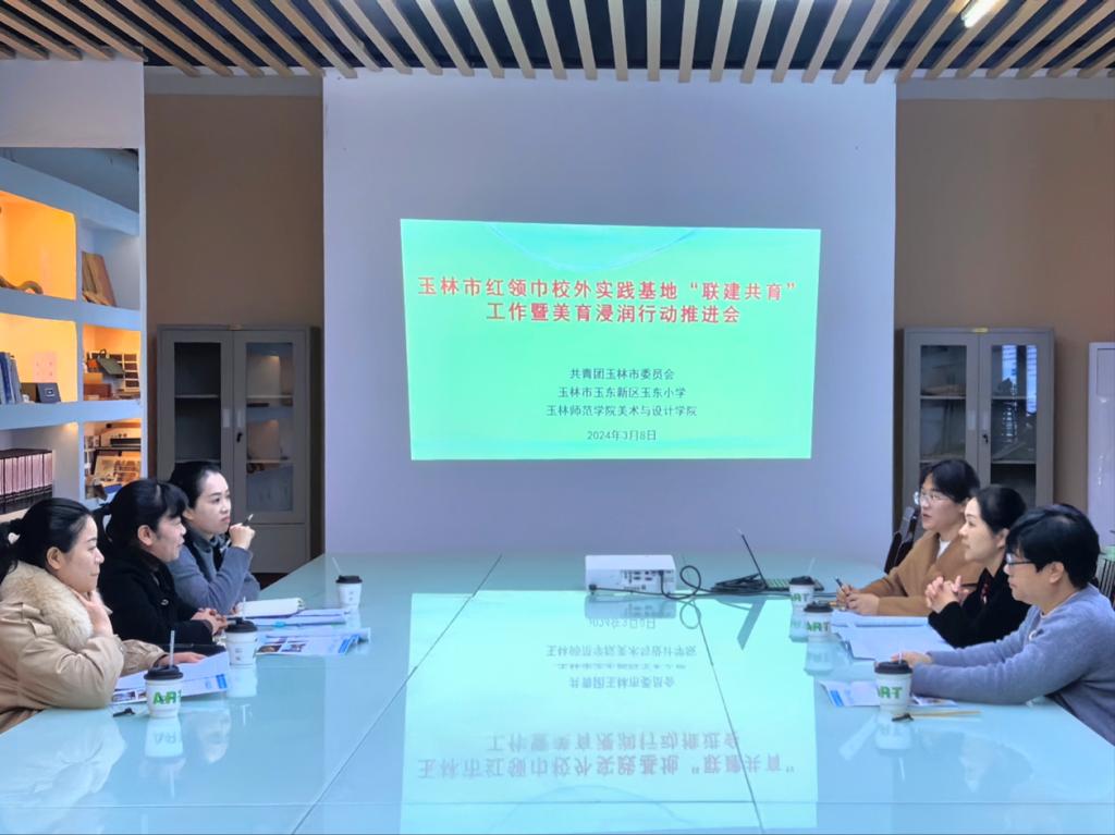 为深入学习贯彻党的二十大精神,深入推进大中小学思政课一体化建设,强化学校美育育人功能,3月8日下午,美术与设计学院于我校东校区综合实训楼会议室召开玉林市红领巾校外实践基地“联建共育”工作暨美育浸润行动推进会。该院党委书记黄培英、副院长邱冬梅(主持行政全面工作)等领导班子成员,团市委学少部长李钟玉,玉东小学德育处主任陈明斌等参加会议。