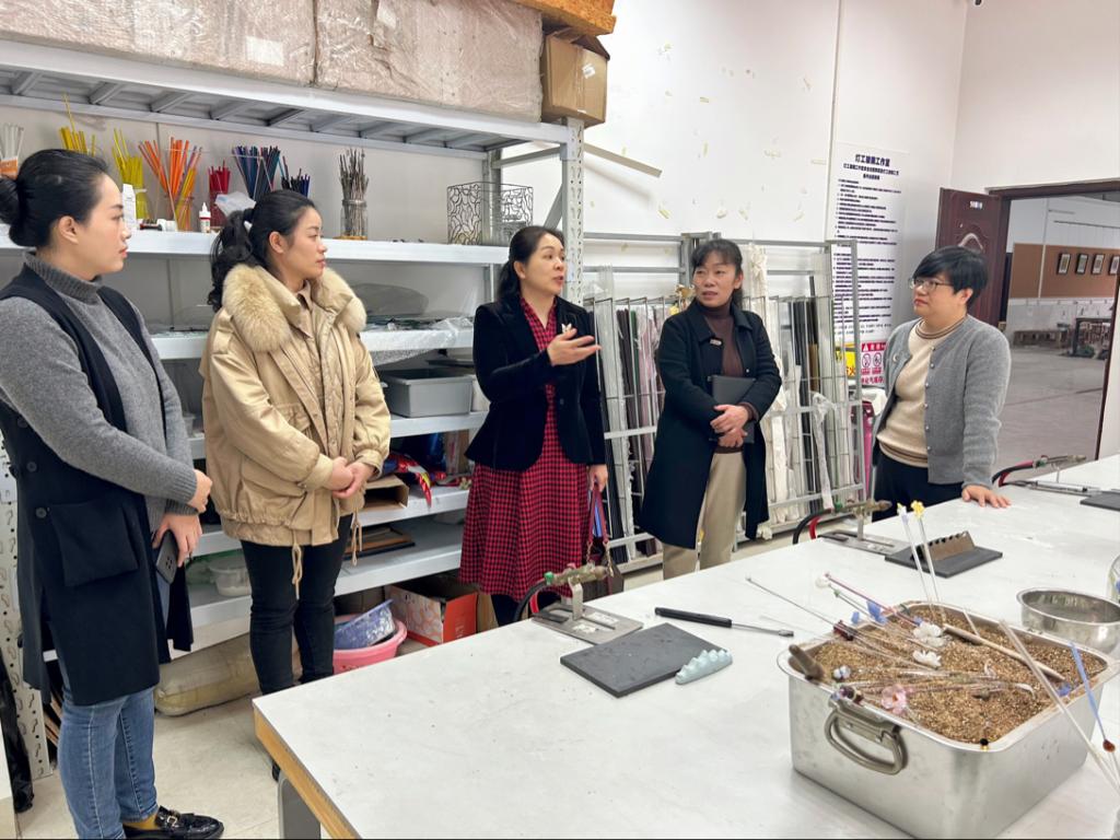 会前,李钟玉一行参观该院“守艺·十二工坊”美育实践基地,黄培英介绍该院实践基地的选择与建设基本情况,李钟玉一行对该院实践基地的建设表示赞赏和肯定。