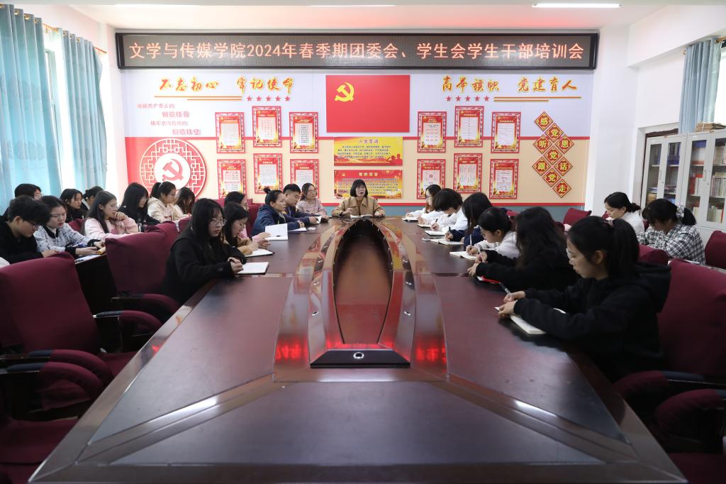 3月12日中午,文学与传媒学院在我校东校区至善楼206党建活动中心召开2024年春季期团委会、学生会学生干部培训会。会议由学院党委副书记邓荫金主讲。全体学生干部参加会议。