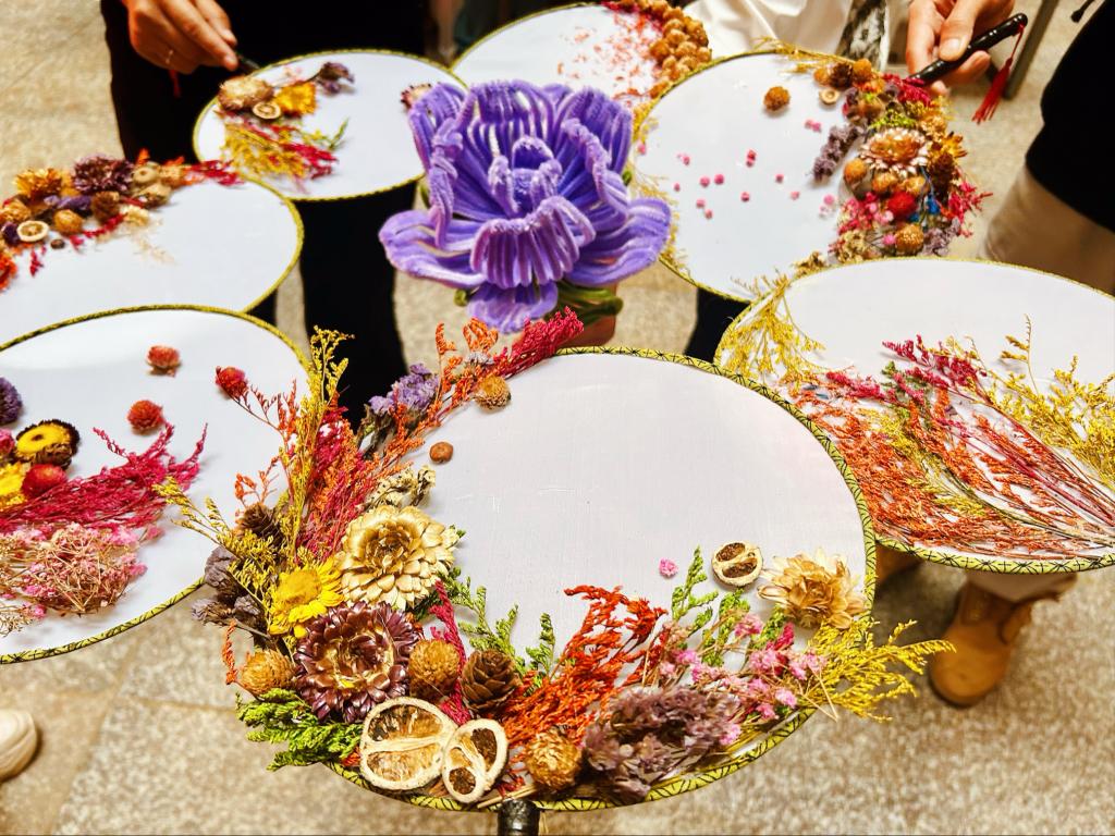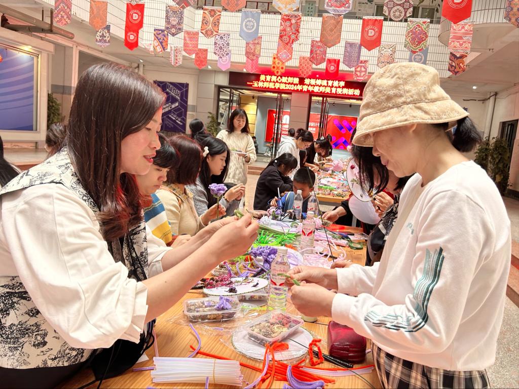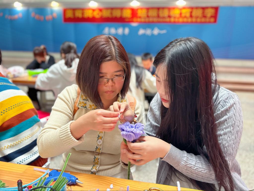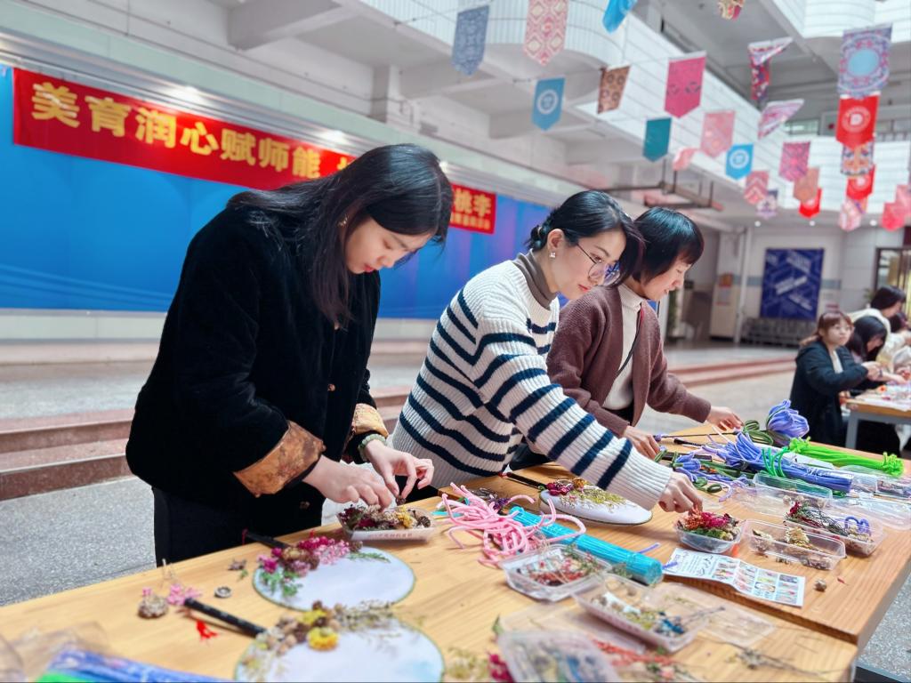 活动现场,青年教师们进行干花团扇制作和扭扭花制作,讲解教师将工具和材料进行分发,并通过现场示范的方式,分步骤细致耐心地向青年教师们讲解干花团扇和扭扭花的制作过程,青年教师们互相配合,细心制作,一把把精美的干花团扇和一朵朵生动的扭扭花跃然掌中,现场氛围轻松愉快、其乐融融。青年教师们表示,在活动中感受到学校内浓厚的美育氛围,自身的美育素养也得到提升。
