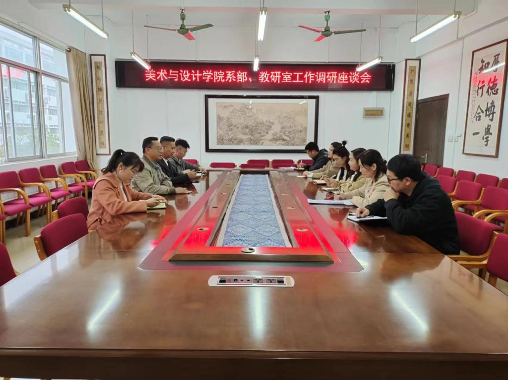 为确保新学期各项工作平稳有序开展,给学院师生营造优良的学习、工作环境,3月13日下午,美术与设计学院于我校东校区博学3-407教室和实训楼206会议室召开系部、教研室工作调研座谈会,该院领导班子代表,辅导员代表及各系部、教研室主任参加座谈会。