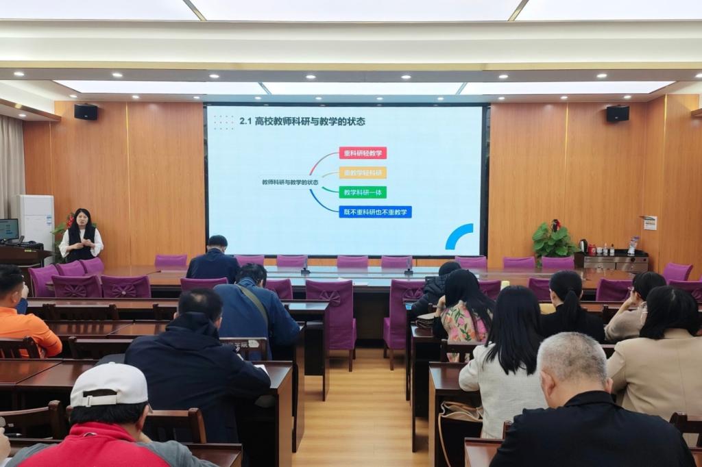 会上,杨振芳首先阐述高校教师教研一体化的必要性,并强调,高校教师教研一体化对促进教师专业发展、创新人才培养模式、实现教育理论与实践的良性互动、改变科研与教学脱节现象具有重要现实意义。随后,她围绕高校教师教研一体化现实障碍中的认识偏差、认识偏颇、行为偏好及价值观偏离展开分析,她希望在座教师要进一步提高教师素质,促进学生成长与发展。最后,她结合自身教学经验,分享自己进行游戏化教学、项目式教学、对分课堂、游戏化对分课堂及同辈教学+学习共同体等方面的教学改革的探索,并鼓励教师通过积极学习、培训、交流,努力提升教育教学研究能力、教学改革能力与专业素质。