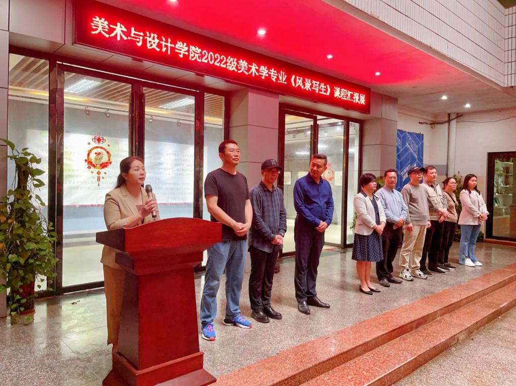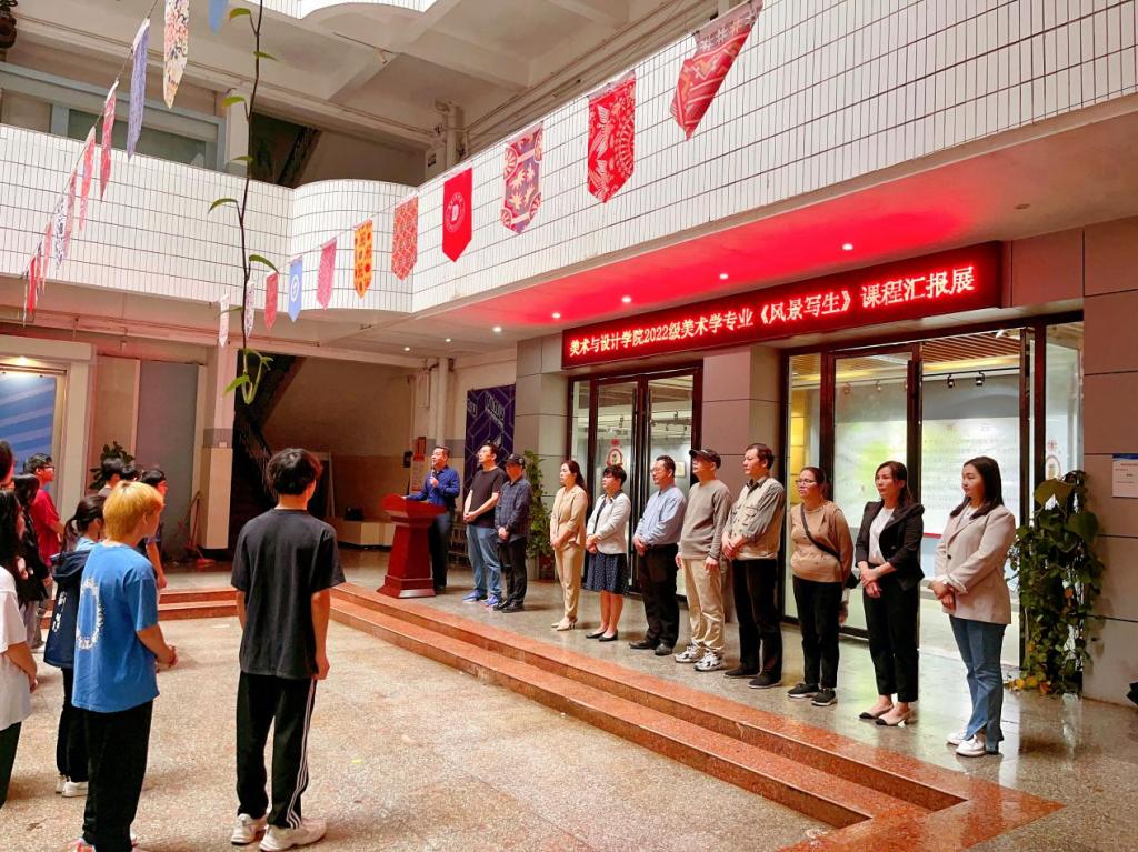 3月25日上午,美术与设计学院于我校东校区综合实训楼展厅举办2022级美术学专业《风景写生》课程作品汇报展。该院党委书记黄培英、副院长邱冬梅(主持行政全面工作)等领导班子成员、教师及学生代表到场参加开幕式并参观展览。