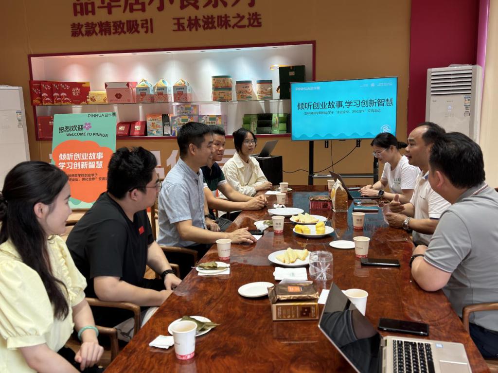 随后,双方进行座谈交流。玉林市品华居食品有限公司董事长李品华对我校师生的到来表示欢迎,向在场人员介绍自己的创业经历,分享自己的创业发展和未来规划,并希望校企双方能在学生实践实训、培训学习等多方面开展深入合作。梁国初对企业负责人的热情接待表示感谢,并对到访学子的基本情况进行介绍。同时,我校创业学子针对自己在创业过程中遇到的问题与负责人进行深入交流探讨,现场气氛浓烈。