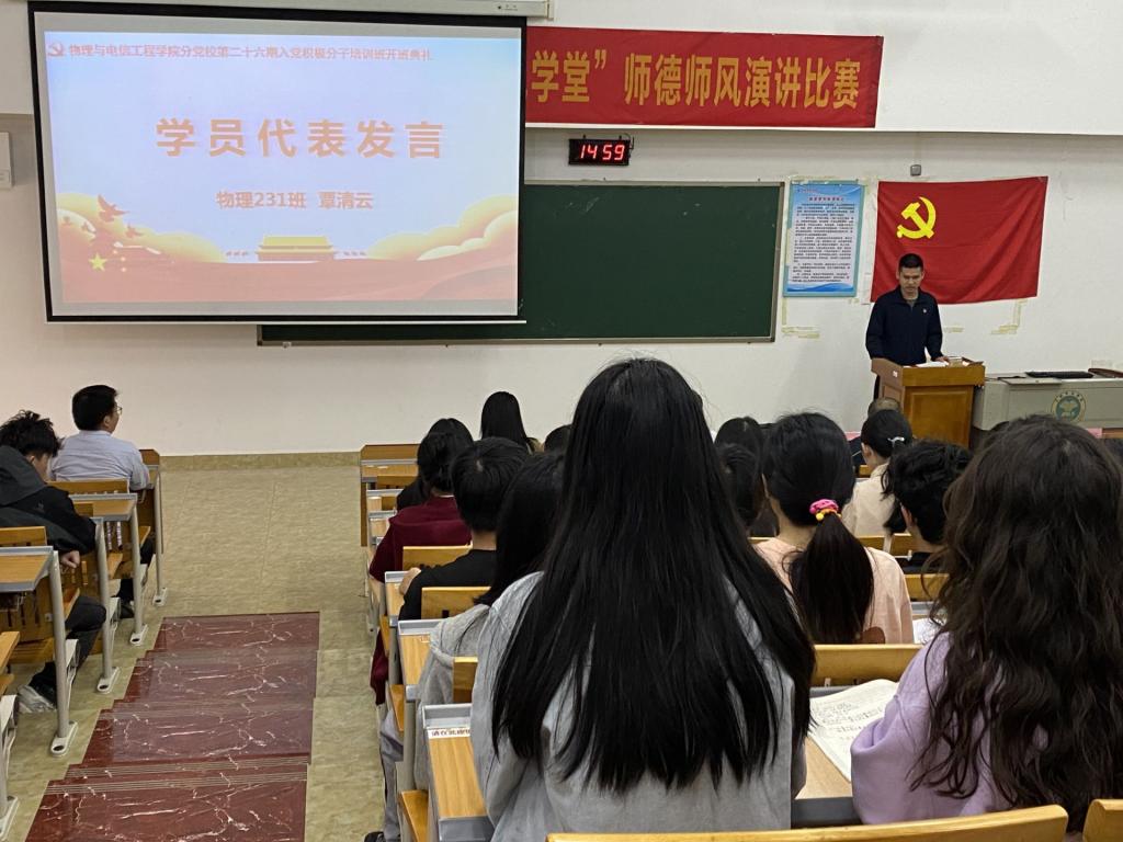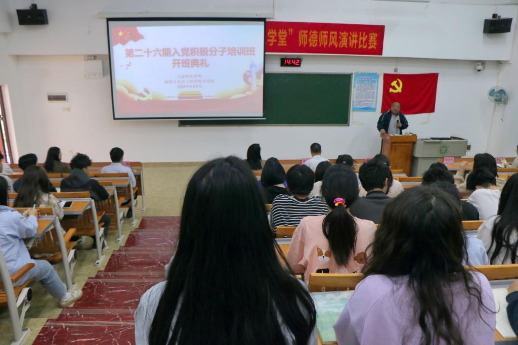 4月9日下午,物理与电信工程学院在我校东校区至善楼408教室举行第二十六期入党积极分子培训班开班典礼暨第一次党课。该院党委书记陈铁军,党委副书记覃艳超,党委专职组织员覃侃,各学生党支部书记及第二十六期全体入党积极分子参加本次开班典礼。典礼由覃侃主持。