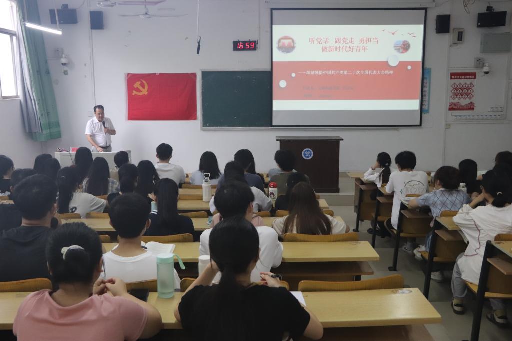 开班典礼后,管金标讲授第一次专题党课《听党话 跟党走 勇担当 做新时代好青年——深刻领悟中国共产党第二十次全国代表大会精神》,旨在让入党积极分子深入了解党的二十大精神,牢记入党初衷,发扬吃苦耐劳的精神,勇担重任,真正把习近平总书记对青年大学生的期望内化于心、外化于行,努力成长为祖国的栋梁之材。