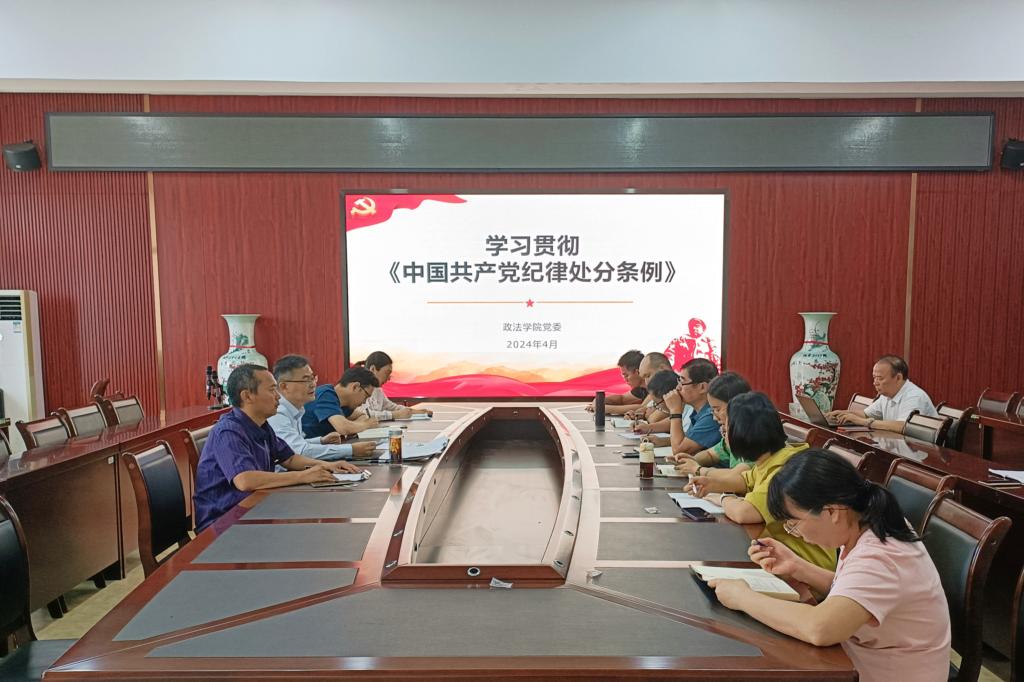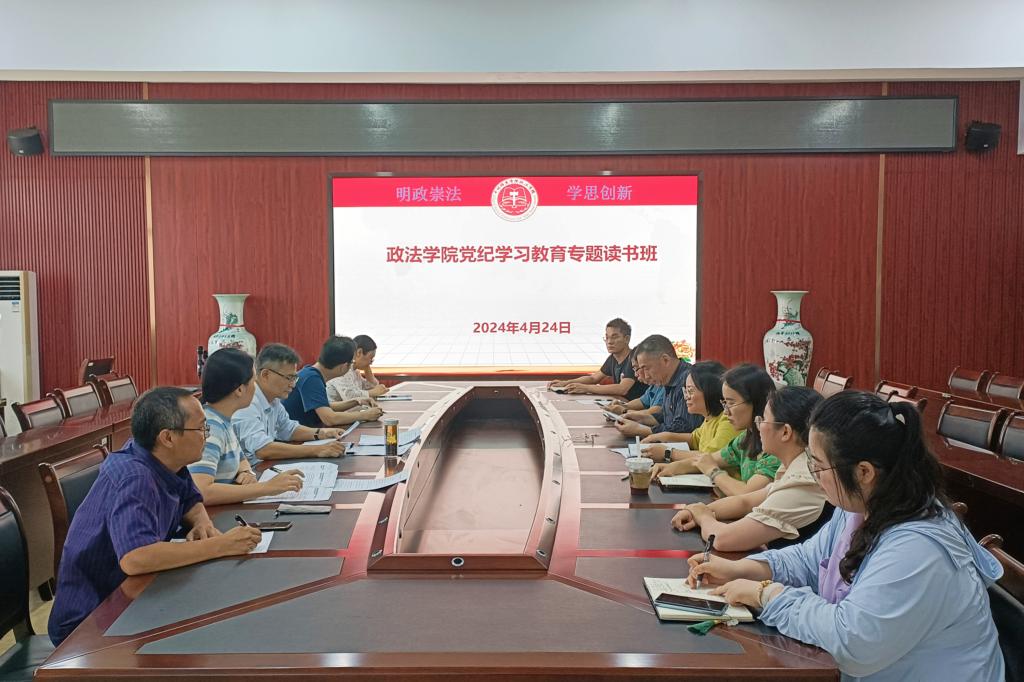 为深入学习贯彻习近平总书记关于党纪学习教育的重要讲话和重要指示精神,推动广大党员干部认真学习修订后的《中国共产党纪律处分条例》(以下简称《条例》),做到学纪、知纪、明纪、守纪。4月24日,政法学院于我校东校区明德楼508会议室举办党纪学习教育专题读书班,该院领导班子、党委委员、纪委委员、办公室主任、党支部书记和辅导员参加。读书班由该院党委书记陈一栋主持并领学《条例》1-6章,党委副书记黄燕纳领学《条例》7-12章。