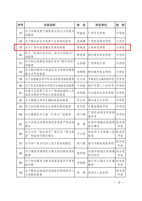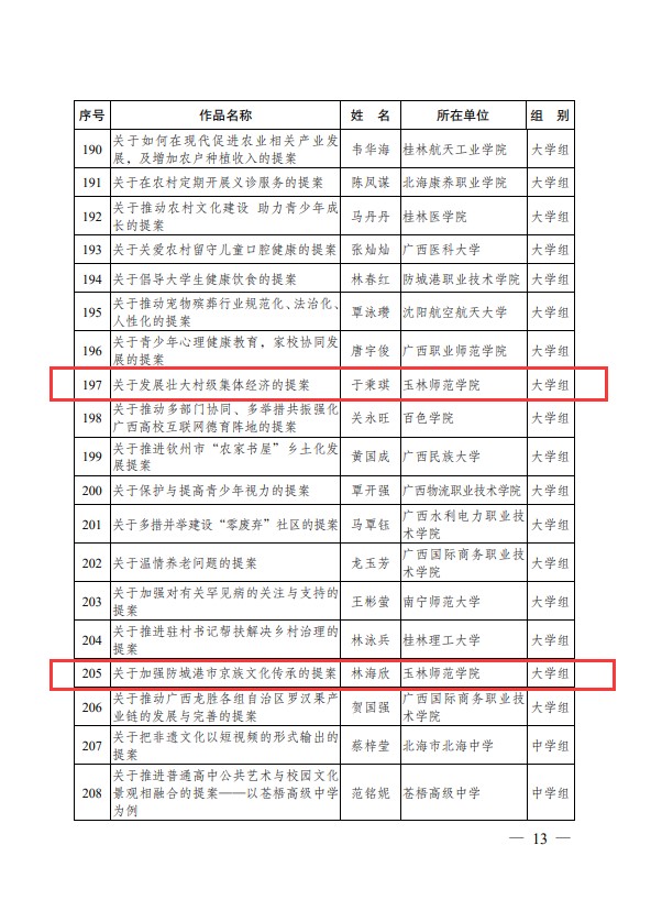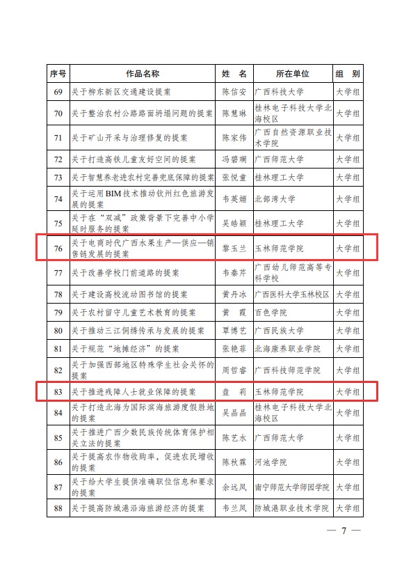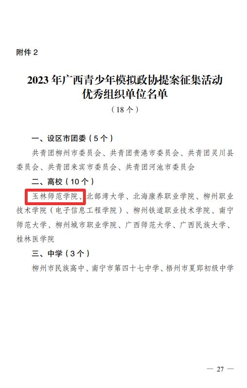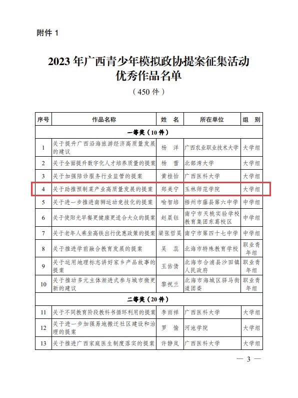近日,共青团广西区委、自治区政协办公厅、自治区教育厅、广西学联联合开展的“2023年广西青少年模拟政协提案征集活动”获奖名单公布。我校入选自治区优秀模拟政协提案作品共计17份,其中化学与食品科学学院《关于助推预制菜产业高质量发展的提案》荣获大学组一等奖,政法学院《关于加快推进广西社区居家养老服务的提案》荣获大学组二等奖,外国语学院《关于广西科技馆建设发展的提案》荣获大学组三等奖,以及共有14个优秀提案荣获优秀奖。我校荣获“2023年广西青少年模拟政协提案征集活动优秀组织单位”。