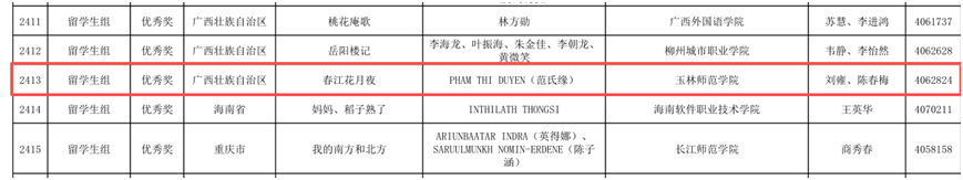 近日,全国第七届中华经典诵写讲大赛评选结果揭晓。历经区赛、全国半决赛、总决赛多轮激烈角逐,我校留学生凭借出色表现在本届 “诵读中国”经典诵读大赛、“诗教中国”诗词讲解大赛在全国舞台上共斩获国家级奖项三项。其中,越南籍留学生黄氏金舒、杨文得以经典诵读作品《钗头凤》赢得“诵读中国”经典诵读大赛一等奖,创下我校在该赛事的最佳成绩。