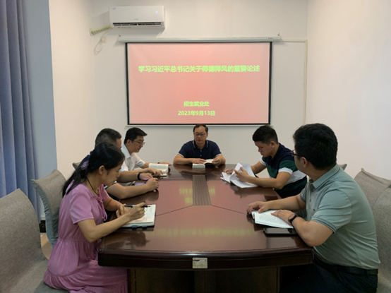 随后,全体干部结合本次专题学习内容上进行深入学习研讨。讨论中与会人员一致认为师德师风建设不仅需要注重统筹兼顾,协调推进,保证日常招生就业工作与师德师风建设活动开展两不误、双促进;同时还需要把思想政治教育贯穿人才培养全过程,不断提高思想认识,进一步加强师德修养,为学校教育事业的发展做出自己应有的贡献。